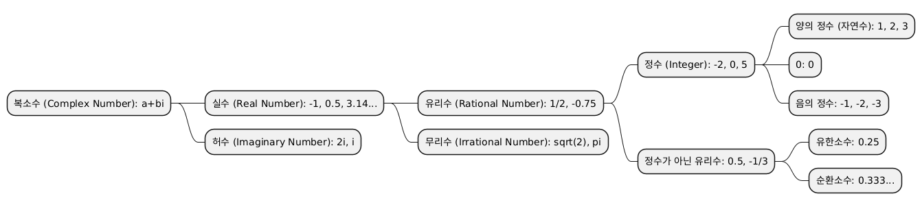복소수 (Complex Number): a+bi실수 (Real Number): -1, 0.5, 3.14...유리수 (Rational Number): 1/2, -0.75정수 (Integer): -2, 0, 5양의 정수 (자연수): 1, 2, 30: 0음의 정수: -1, -2, -3정수가 아닌 유리수: 0.5, -1/3유한소수: 0.25순환소수: 0.333...무리수 (Irrational Number): sqrt(2), pi허수 (Imaginary Number): 2i, i
